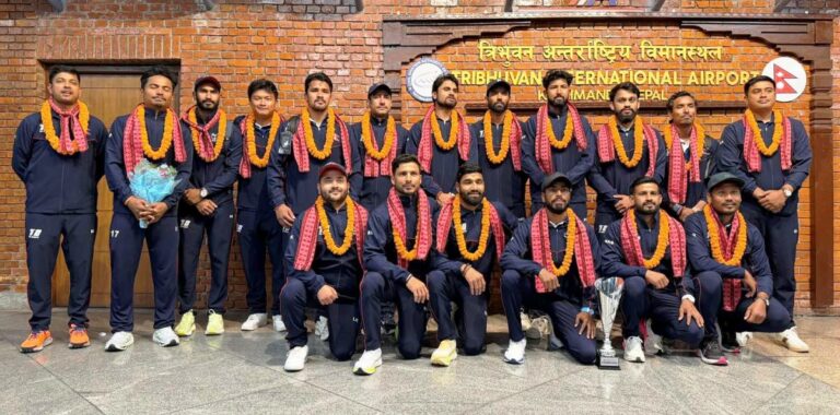 काठमाडौं – आईसीसी विश्वकप क्रिकेट लिग-२ अन्तर्गत युएई शृङ्खला खेलेर नेपाली क्रिकेट टिम स्वदेश फर्किएको छ। यूएई शृङ्खलामा चारै खेल गुमाएको नेपाल मध्यरातमा स्वदेश फर्किएको हो। विमानस्थलमा नेपाली खेलाडीलाई खेलकुद मन्त्री बब्लु गुप्ता, नेपाल क्रिकेट संघ क्यानका सचिव पारस खड्कालगायतले स्वागत गरे।