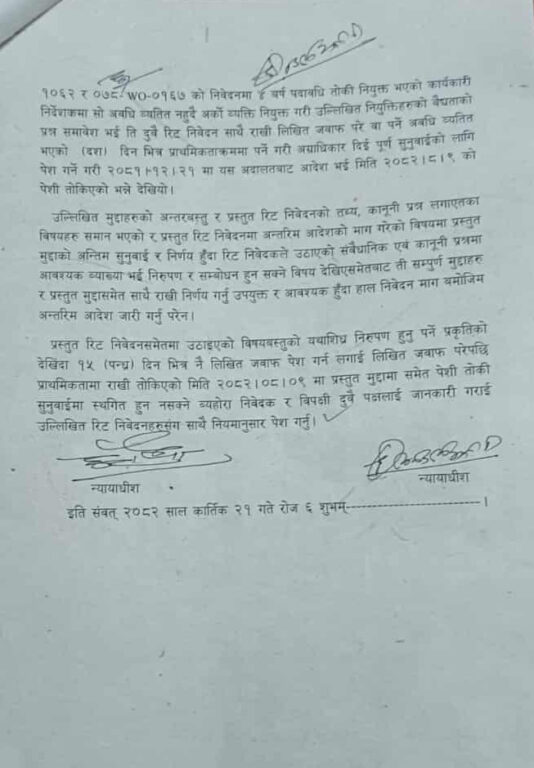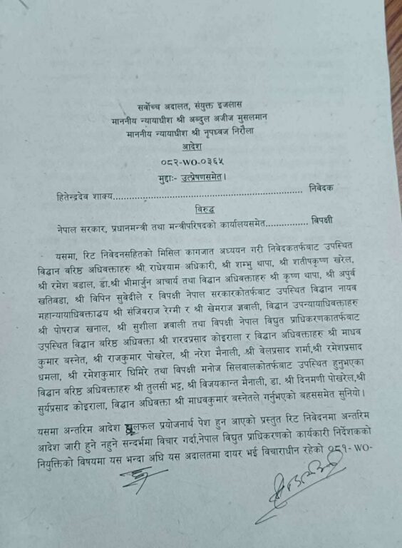 शुक्रबार न्यायाधीशद्वय अब्दुल अजीज मुसलमान र नृपध्वज निरौलाको संयुक्त इजलासले अन्तरिम आदेशको माग अस्वीकार गर्दै मुद्दाको अन्तिम सुनुवाइका लागि मंसिर ९ गते मिति तोकेको हो।