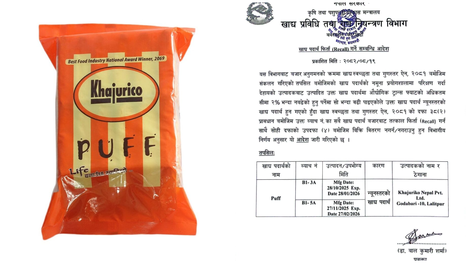 खाद्य विभागले ललितपुर गोदावरी–१० स्थित खजुरीको नेपालले उत्पादन गरेको पफ ‘न्यूनस्तरको खाद्य पदार्थ’ ठहर गर्दै उक्त उद्योगबाट उत्पादित ब्याच नम्बर बी १ थ्री ए र ब्याच नम्बर बी १ फाइभ ए का पफहरू बजारबाट तुरुन्त फिर्ता लैजान र थप बिक्री नगर्न निर्देशन दिएको छ ।