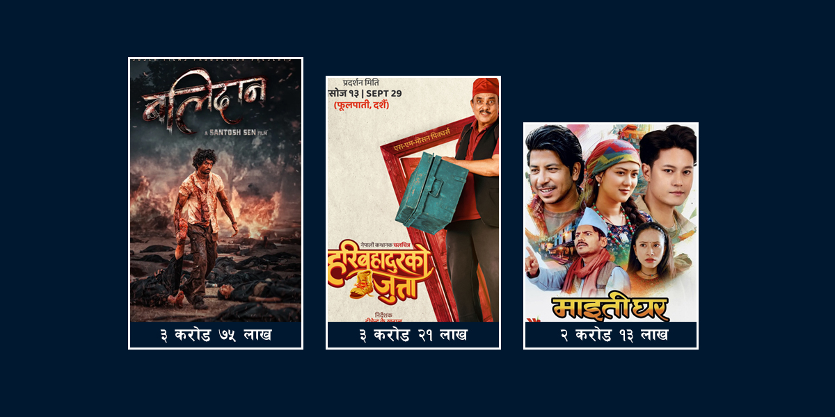काठमाडौं – दशै लक्षित गरी प्रदर्शनमा आएका तीन फिल्महरु ‘बलिदान’, ‘हरिबहादुरको जुत्ता’ र ‘माइतीघर’ले न्यून ग्रस कलेक्सन गरेको पाइएको छ ।