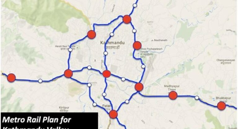 १०) तत्कालका लागि सरकारले काठमाडौं उपत्यकामा तीनवटा मेट्रोरुट (चित्रमा देखाए जस्तो), उत्तर–दक्षिण, पूर्व–पश्चिम र रिङ रोडलाई प्राथमिकतामा राखी योजनागत निर्णय लिएर काम सुरु गर्न सक्छ । रिङ रोडमा अहिले पनि एलिभेटेड मेट्रो निर्माण सम्भव छ । ढिलो भए जमिनमुनि बनाउने अवस्था आउनेछ, जसको लागत अत्यन्तै महँगो पर्छ । यी तीनवटा लाइन पहिलो चरणका लागि पर्याप्त हुन्छन्, र यसको लागत धान्नै नसक्ने जति हुँदैन । तर योजनाको डिजाइन र सञ्चालन मोडेल किफायती बनाउनेमा विशेष ध्यान दिनुपर्छ ।