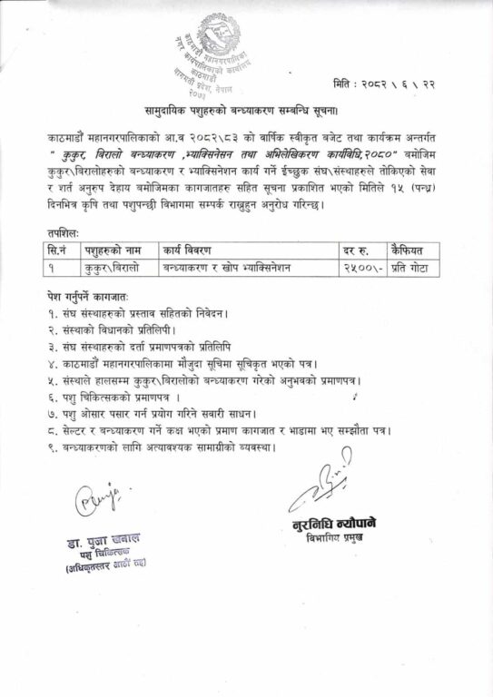 पशु स्वास्थ्य प्रमुख डा. पूजा खनाल र विभागीय प्रमुख नृगमि न्यौपानेद्वारा हस्ताक्षरित सूचनामा भनिएको छ, ‘सडकमा रहेका कुकुर बिरालोको संख्या नियन्त्रणका लागि यो अभियान प्रभावकारी रूपमा अघि बढाइनेछ।’