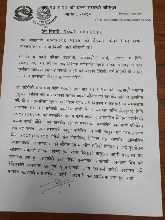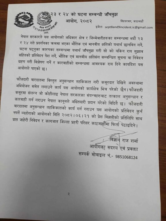 आयोगका सदस्य एवं प्रवक्ता विज्ञान राज शर्माद्वारा हस्ताक्षरित पत्रमा प्रदर्शनका क्रममा भएका भौतिक र मानवीय क्षतिको यथार्थ छानबिन गरी त्यसका कारण र सिफारिससहितको प्रतिवेदन सरकारलाई बुझाउने जिम्मेवारी पाएको बताइएको छ।