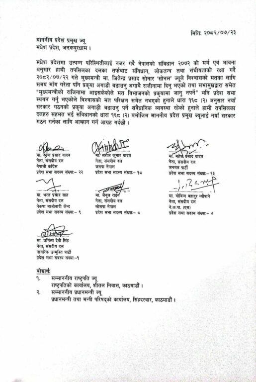पत्रमा कांग्रेस संसदीय दलका नेता कृष्ण प्रसाद यादव, नेकपा माओवादी केन्द्रसंसदीय दलका नेता भरतकुमार साह, जनमत पार्टीका महेशकुमार यादव, जसपा नेपालका सरोज कुमार यादव, लोसपा नेपालका जैनुल राईन, नेकपा एकीकृत समाजवादी का गोविन्द बहादुर न्यौपाने र नागरिक उन्मुक्ति पार्टीका उर्मिलादेवी सिंहले हस्ताक्षर गरेको पत्र प्रदेश प्रमुखलाई बुझाइएको हो।