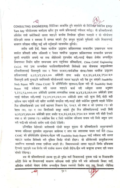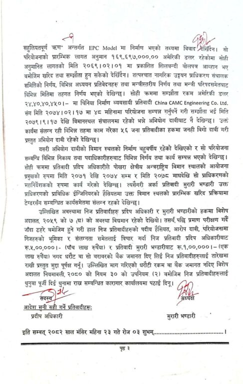 अख्तियार दुरुपयोग अनुसन्धान आयोगको तर्फबाट सरकारी वकिलहरूले प्रतिवादीहरूले पोखरा विमानस्थलको लागत स्वीकृत अनुमानभन्दा अस्वाभाविक रूपमा ७.४३ मिलियन अमेरिकी डलर, अर्थात् करिब ८.३६ अर्ब रुपैयाँले बढाई मिलेमतोमा भुक्तानी गरेको दाबी गरेका थिए।