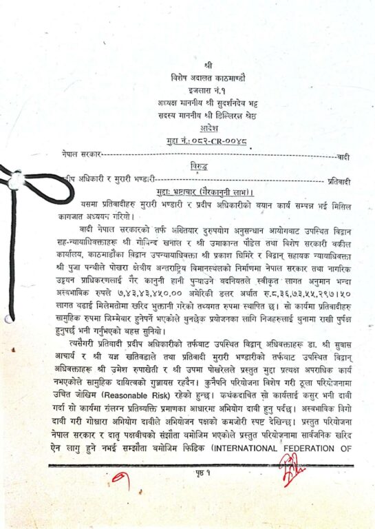 विशेष अदालतको इजलास नम्बर १ (अध्यक्ष सुदर्शनदेव भट्ट र सदस्य डिल्लीरत्न श्रेष्ठ) ले मंगलबार जारी गरेको आदेशमा दुवै प्रतिवादीको बयान तथा मिसिल कागजात अध्ययनपछि अभियोग दाबीमा उठाइएका आरोप गम्भीर प्रकृतिका रहेको उल्लेख छ।