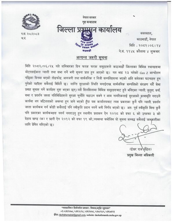 ‘विभिन्न समूहहरूबाट हुने भनिएका र्याली, जुलुस, धर्ना, सभा र प्रदर्शन जस्ता गतिविधिहरूले सुरक्षा चुनौती बढाउन सक्ने र आम नागरिकलाई सुरक्षाको प्रत्याभूति गराउने कार्यमा थप जटिलताको अवस्था हुन जाने भएको हुँदा यस कार्यालयबाट त्यस प्रकारका कुनै पनि र्याली, प्रदर्शनजस्ता कार्यक्रम गर्न कोही कसैलाई पनि स्वीकृति प्रदान नगर्ने भनी निर्णय भएको छ’, प्रशासन कार्यालयको सूचनामा भनिएको छ ।
