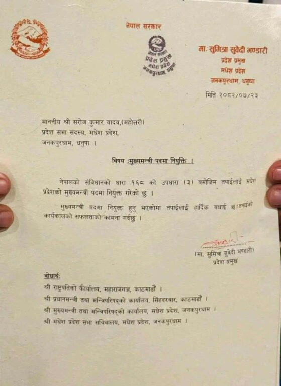 प्रदेश प्रमुखले जारी गरेको नियुक्तिपत्रमा भनिएको छ, ‘नेपालको संविधानको धारा १६८ को उपधारा (३) बमोजिम तपाईँलाई मधेश प्रदेशको मुख्यमन्त्री पदमा नियुक्त गरेको छु। मुख्यमन्त्री पदमा नियुक्त हुनुभएकोमा हार्दिक बधाई तथा कार्यकालको सफलताको कामना गर्दछु।’