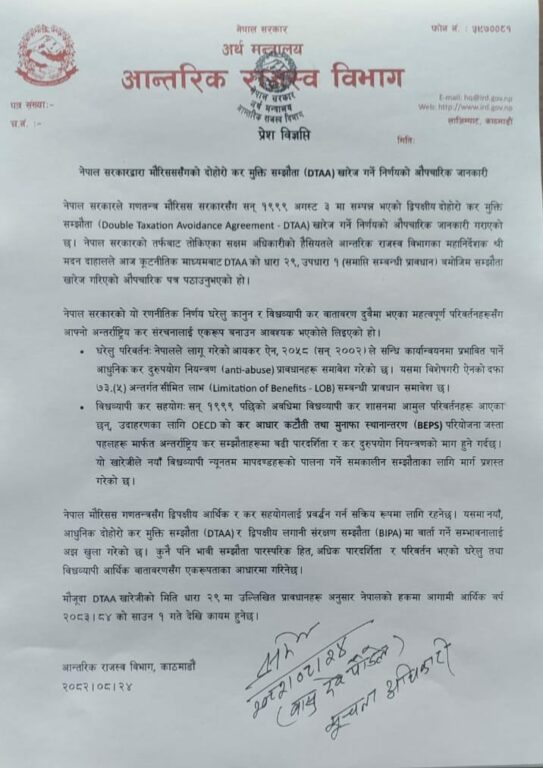 नेपालले मौरिससलाई पठायो दोहोरो कर मुक्ति सम्झौता खारेज भएको निर्णय