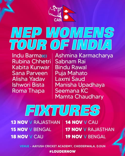 नेपालले भारत भ्रमणमा नोभेम्बर १३ र १७ तारिखमा राजस्थानसँग प्रतिस्पर्धा गर्नेछ भने नोभेम्बर १४ र १८ तारिखमा उत्तराखण्डसँग खेल्नेछ । नोभेम्बर १५ र १९ तारिखमा भने बंगालसँग भिड्नेछ ।