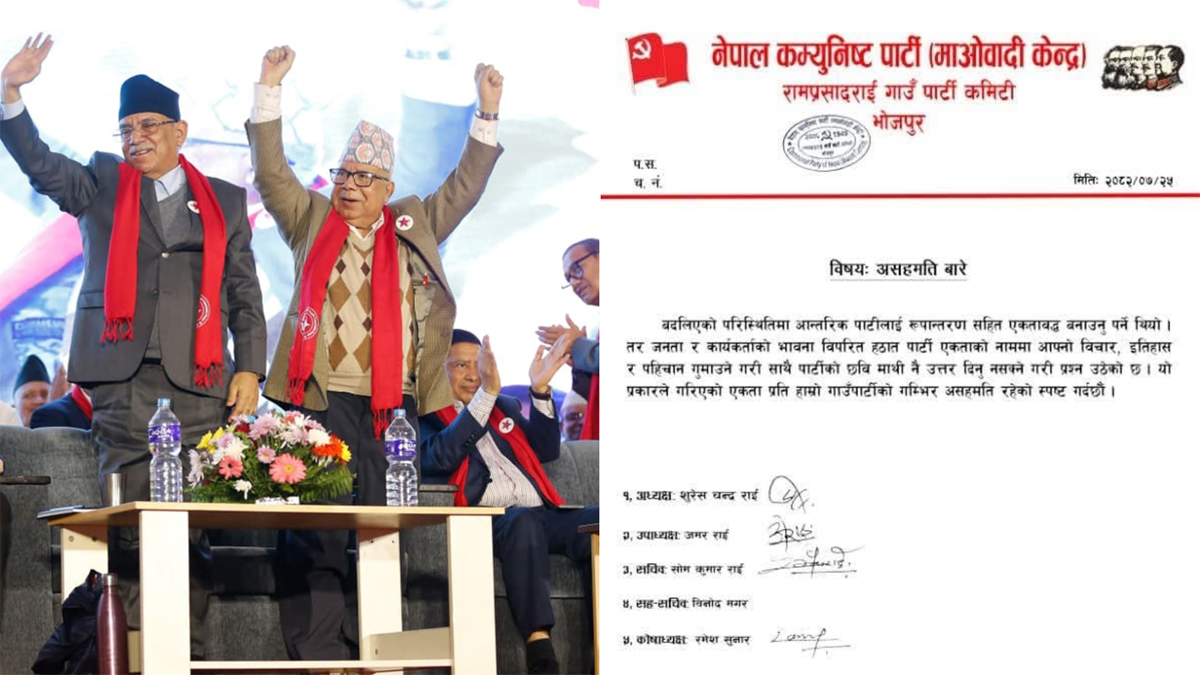 भोजपुर- नेपाल कम्युनिष्ट पार्टी (माओवादी केन्द्र) को भोजपुरस्थित रामप्रसादराई गाउँ पार्टी कमिटीले यही कात्तिक १९ गते भएको एकता प्रक्रियाप्रति गम्भीर असहमति जनाएको छ।
