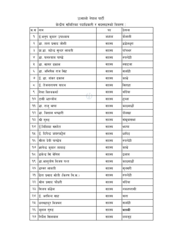 उज्यालो नेपाल पार्टीका पदाधिकारी र सदस्य
