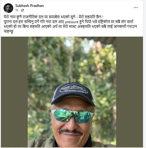 ‘मेरो नाम कुनै राजनीतिक दल मा समावेश भएको सुनेँ। मेरो सहमति छैन,’ उनले भनेका छन्, ‘पुराना दलहरू सच्चिनु पर्ने गरी नयाँ दल आए प्रेसर हुने थियो भन्ने दृष्टिकोणमा सबैसँग वार्ता भएको हो। तर बिना सहमति आएको अर्थमा मेरो स्पष्ट असहमति भएको सबैलाई जानकारी गराउन चाहन्छु।’