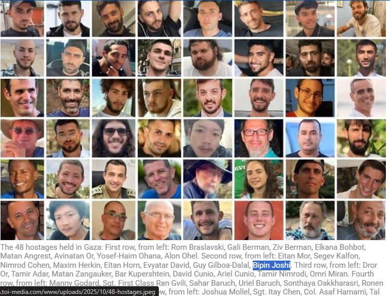 विपिन जोशी, एक नेपाली विद्यार्थी थिए । दक्षिण इजरायलको अलुमिम किबुत्जमा खेतमा काम गर्दै गर्दा अपहरणमा परेका थिए। उनको परिवारले हालै इजरायली सेनाले गाजाबाट फेला पारेको भिडियोमा विपिनलाई जीवित देखिएको पुष्टि गरेको छ।