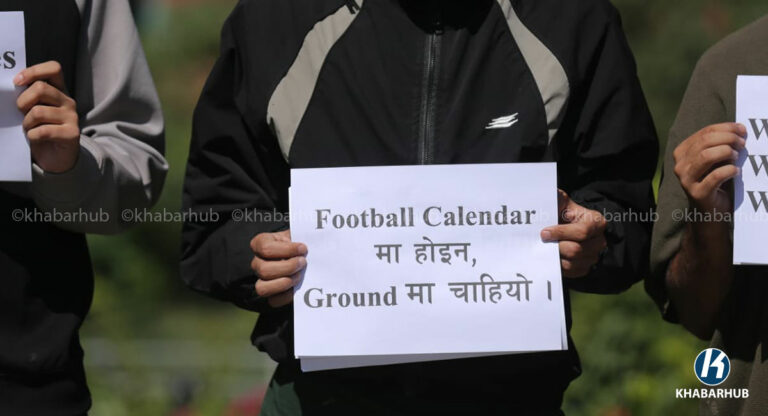 धर्नामा सहभागीहरूले ‘फुटबल क्यालन्डरमा होइन, ग्राउण्डमा चाहियो, विश्वकप त ४ वर्षमा आउँछ ‘ए’ डिभिजन कहिले आउँछ’ जस्ता प्लेकार्डसहित प्रदर्शन गरेका थिए ।