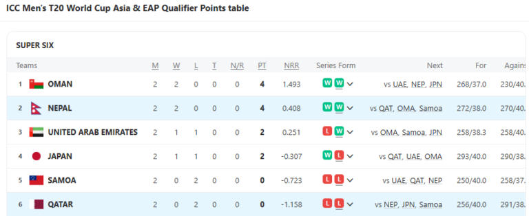 सुपर सिक्सको तालिकामा ओमान र नेपालको समान चारचार अंक छ। रनरेटको आधारमा ओमान शीर्ष स्थानमा छ भने नेपाल दोस्रो स्थानमा छ। दुई अंक जोडेका यूएई र जापान क्रमशः तेस्रो र चौथो स्थानमा छन्। कतार र सामाओ भने अंकबिहीन छन्।