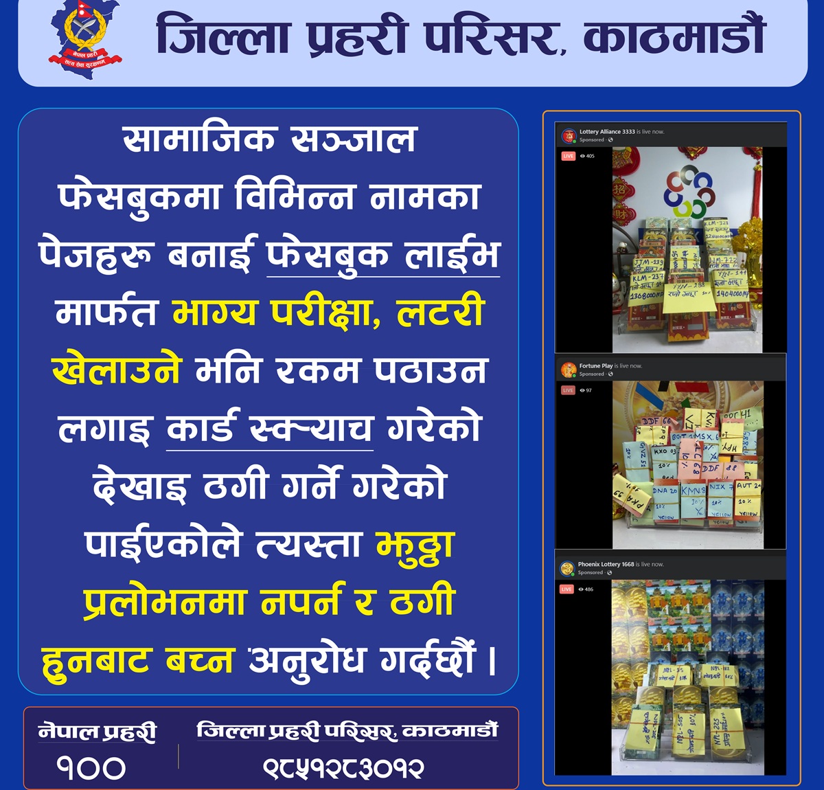 सामाजिक सञ्जाल फेसबुकमा विभिन्न नामका पेजहरू बनाइ लाइभमार्फत भाग्य परीक्षा, लटरी खेलाउने भन्दै रकम पठाउन लगाइ कार्ड स्क्र्‍याच गरेको देखाइ ठगी गर्ने क्रम बढेपछि प्रहरीले यस्तो सचेत रहन आग्रह गरेको छ ।