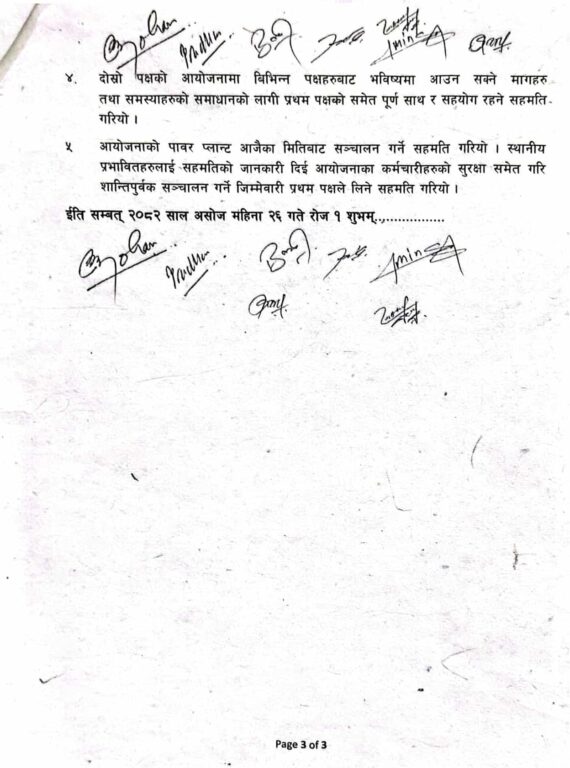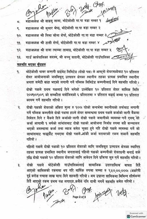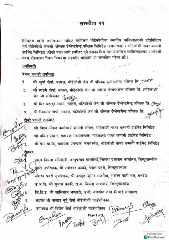 साथै, सो सम्झौतामा राज्यको विभिन्न तहका अधिकारीहरू समेत रोहवरमा बसेर हस्ताक्षर गरेको देखिन्छ । जसमा सिन्धुपाल्चोक जिल्ला प्रशासन कार्यालयका प्रमुख जिल्ला अधिकारी बन्धुप्रसाद बास्तोला, प्रहरी उपरिक्षक रामेश्वर कार्की, उर्जा, जलस्रोत सिँचाइ मन्त्रालयका उपसचिव शालिग्राम भण्डारी र भोटेकोशी गाउँपालिकाका अध्यक्ष पासाङ नुर्पु शेर्पा सहित १३ जनाले हस्ताक्षर गरेका छन् ।