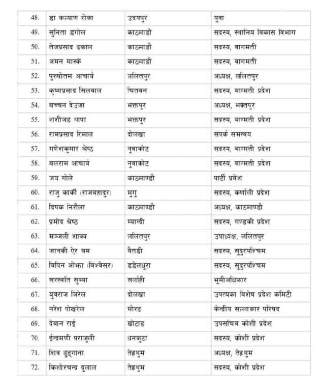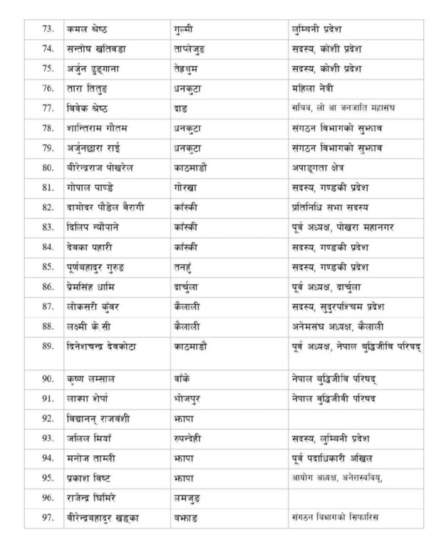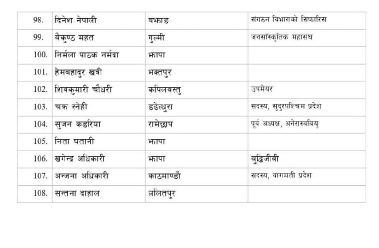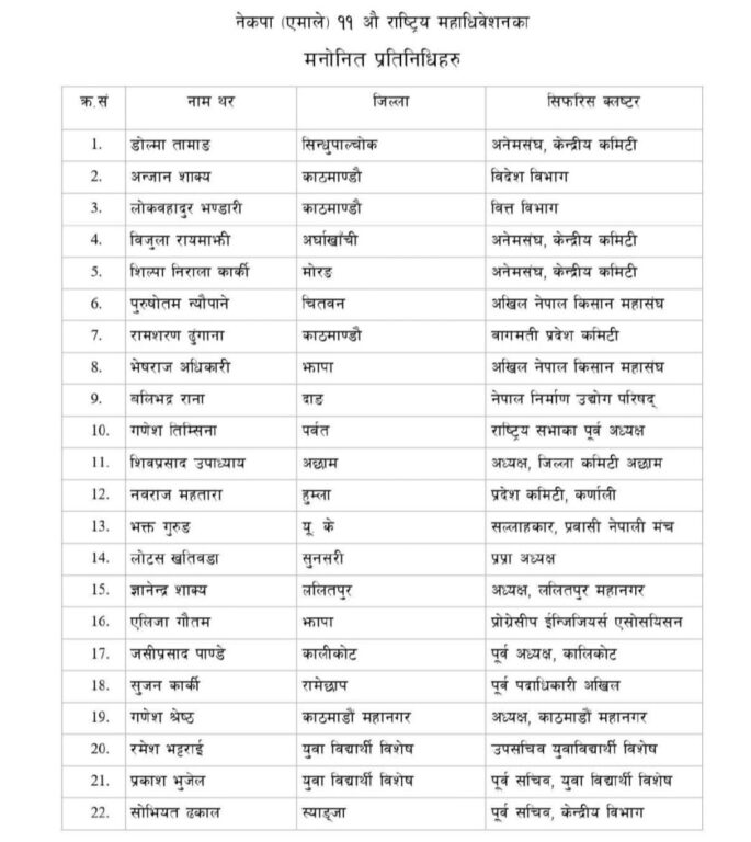 कुल प्रतिनिधिको ५ प्रतिशत अर्थात् १ सय ८ जना मनोनीत प्रतिनिधिको नाम पार्टीले सार्वजनिक गरेको हो ।