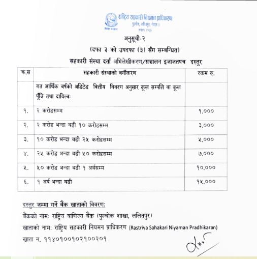 २ करोड रुपैयाँसम्म पुँजी भएका संस्थाले १ हजार रुपैयाँ, २ देखि १० करोडसम्मका संस्थाले ३ हजार, १० देखि २५ करोडसम्मका संस्थाले ५ हजार, २५ देखि ५० करोडसम्मका संस्थाले ७ हजार, ५० करोडदेखि १ अर्बसम्मका संस्थाले १० हजार, र १ अर्बभन्दा बढी पुँजी भएका सहकारीहरूले १५ हजार रुपैयाँ नवीकरण शुल्क तिर्नुपर्नेछ।