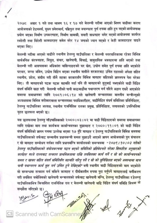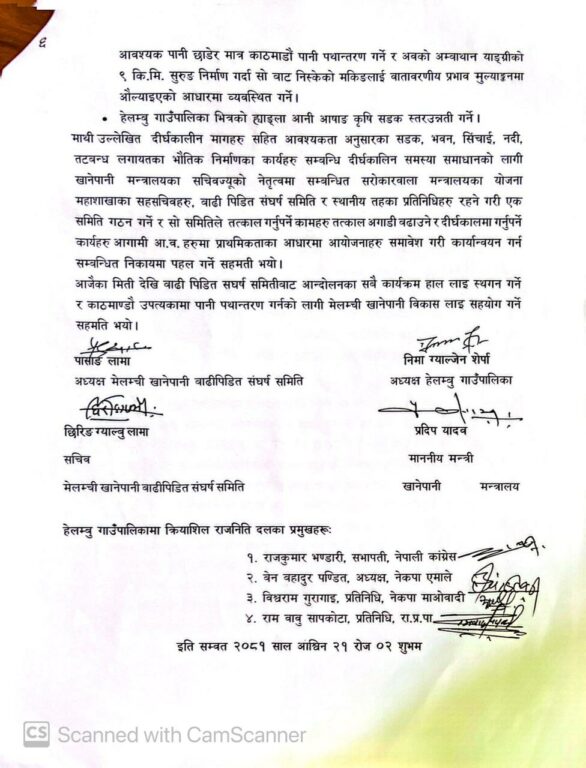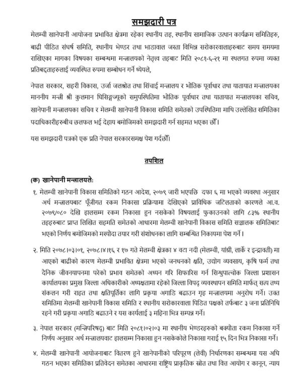उनीहरुको माग सम्बोधनका लागि मंगलबार ऊर्जा जलस्रोत तथा सिँचाइ मन्त्रालयमा पुनः सम्झौता भएको छ । उक्त सम्झौतामा के-के विषय समेटिएको छ ? मेलम्चीका पालिकाको संघ सरकारसँगको सहकार्य कस्तो छ ? बारम्बार धर्नामा उत्रिनुपर्ने अवस्था किन सिर्जना भइरहेको छ ? वर्तमान सरकारले समाधान गर्छ भन्नेमा कत्तिको विश्वस्त हुनुहुन्छ भन्नेबारे हेलम्बु गाउँपालिकाका अध्यक्ष निमा ग्याल्जेन ह्योल्मोसँग गरिएको कुराकानीको सम्पादित अश :