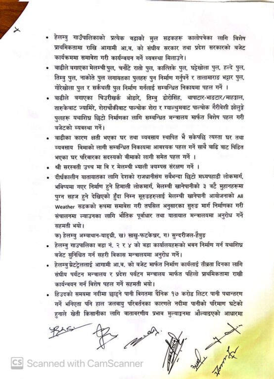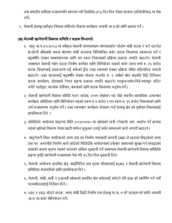 यस्तै, मेलम्ची अम्बाथान मेलम्ची घ्यांग सडक निर्माणका लागि विनियोजन भएको बजेट रकममध्ये २५ करोड रुपैयाँ सडक विभागलाई हस्तान्तरण भइसकेको हुँदा उक्त सडक बनाउने लगायतका कुरा उल्लेख गरिएको छ । आयोजनाले ४५ करोड दिने पहिले नै मेलम्चीबासीसँग सम्झौता गरेको थियो । सो अन्तर्गत मेलम्ची आयोजनाको मुख्य मुहानसम्म जान सडक अवरोध नहोस् भनेर मुख्य सडक र त्यसको वैकल्पिक सडक आयोजनाले नै बनाउनुपर्ने हो । सोही अनुसार २५ अर्ब मुख्य सडक र २० अर्ब वैकल्पिक सडकका लागि भनिएको थियो । त्यसैले मुख्य सडक तत्काल बनाउन हामीले दबाब दिएका हौं ।