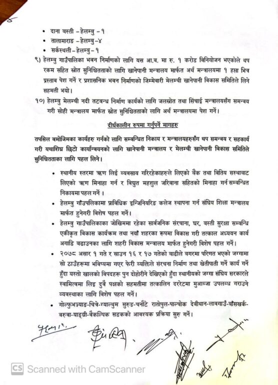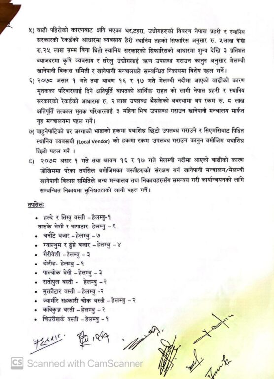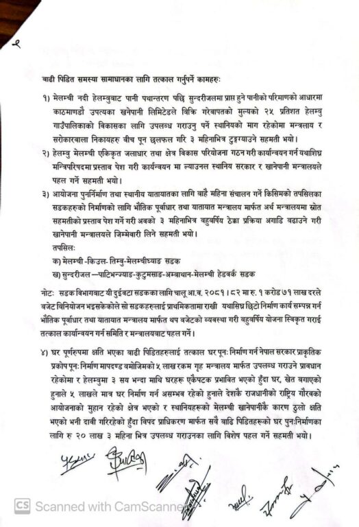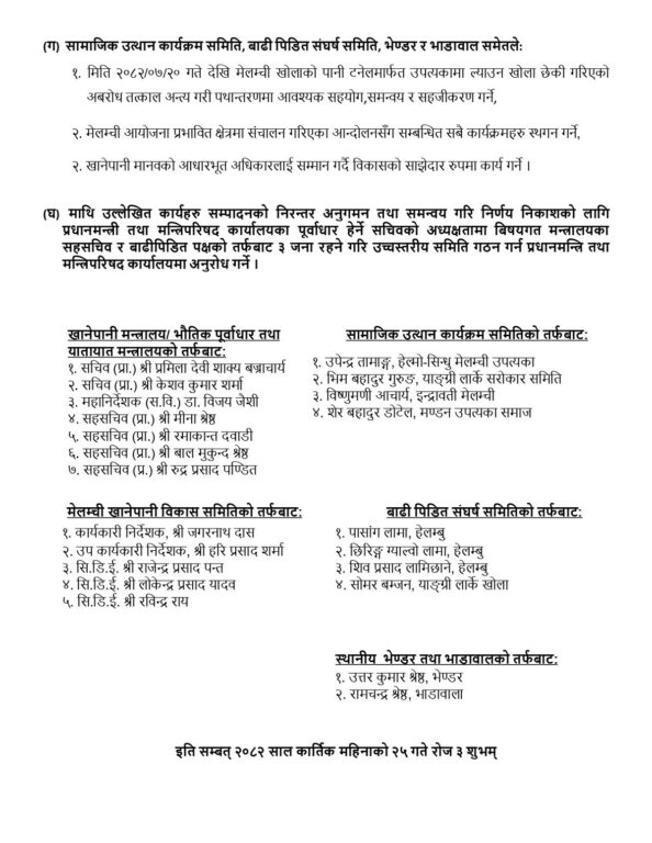 मेलम्ची खानेपानी विकास समितिको गठन आदेश, २०७९ अनुसार संसोधन गर्नुपर्ने कुरामा संसोधन गरेर क्षतिपूर्तिका लागि स्थानीयको समेत सहभागिता रहनेगरी तीन महिनाभित्र गृह मन्त्रालयमा रिपोर्ट पठाइनेछ । अर्थ मन्त्रालयबाट हालसम्म निकासा हुन नसकेको रकम १५ दिनभित्र निकासा गरिने जनाइएको छ । खानेपानी परिपुरण (लेवी) दिनेबारे ४५ दिनभित्र सम्बन्धित मन्त्रालयको सहकार्यमा मन्त्रिपरिषदमा प्रतिवेदन पेश गरिनेछ ।