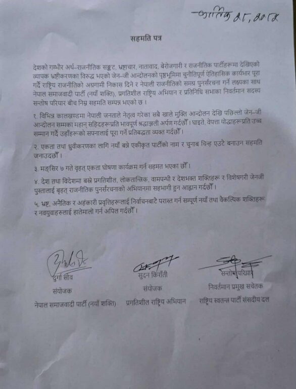 सहमतिपछि जारी गरिएको पत्रअनुसार नेपालको राजनीतिक समग्र पुनर्संरचना गर्ने लक्ष्यसहित नेपाल समाजवादी पार्टी नयाँ शक्ति प्रगतिशील राष्ट्रिय अभियान र प्रतिनिधिसभाका निवर्तमान सदस्य सन्तोष परियार एक मत भएको उल्लेख छ ।