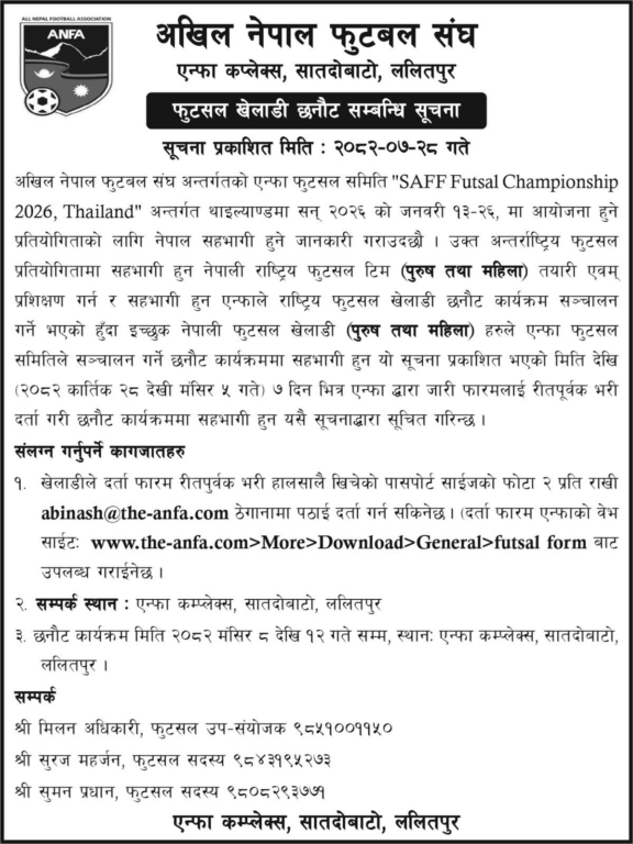 काठमाडौं– अखिल नेपाल फुटबल संघ (एन्फा) ले ‘साफ फुटसल च्याम्पियनसिप २०२६’ का लागि टिम गठन गर्न खेलाडी छनोट प्रक्रिया सुरु गरेको छ ।