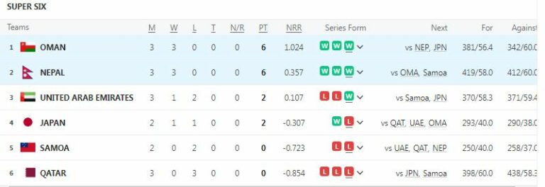 सुपर सिक्सको तालिकामा ओमान र नेपालको समान ६-६ अंक छ। रनरेटको आधारमा ओमान शीर्ष स्थानमा छ भने नेपाल दोस्रो स्थानमा छ। दुई अंक जोडेका यूएई र जापान क्रमशः तेस्रो र चौथो स्थानमा छन्। कतार र सामाओ भने अंकबिहीन छन्।