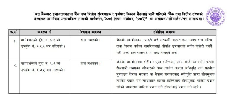 केन्द्रीय बैंकले मार्गदर्शनमा व्यवस्था गर्दै सामाजिक उत्तरदायित्व बापत खर्च गर्ने रकम जेन-जी आन्दोलनमा घाइते भई सरकारी अस्पतालमा उपचाररत गरिब तथा विपन्न वर्गका औषधि उपचारको लागि दोहोरो नपर्ने गरी उक्त अस्पताललाई उपलब्ध गराइने खर्चमा गर्न सकिने व्यवस्था गरेको छ ।