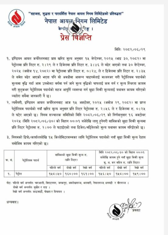 निगमका अनुसार पेट्रोलको मूल्य प्रतिलिटर दुई रुपैयाँले घटाइएको हो। मूल्य घटेपछि अब पहिलो वर्गका उपभोक्ताले प्रतिलिटर १५८ रुपैयाँ ५० पैसा तिर्नुपर्नेछ। दोस्रो वर्गका लागि मूल्य १६० रुपैयाँ र तेस्रो वर्गका लागि १६१ रुपैयाँ निर्धारण गरिएको निगमले जनाएको छ।