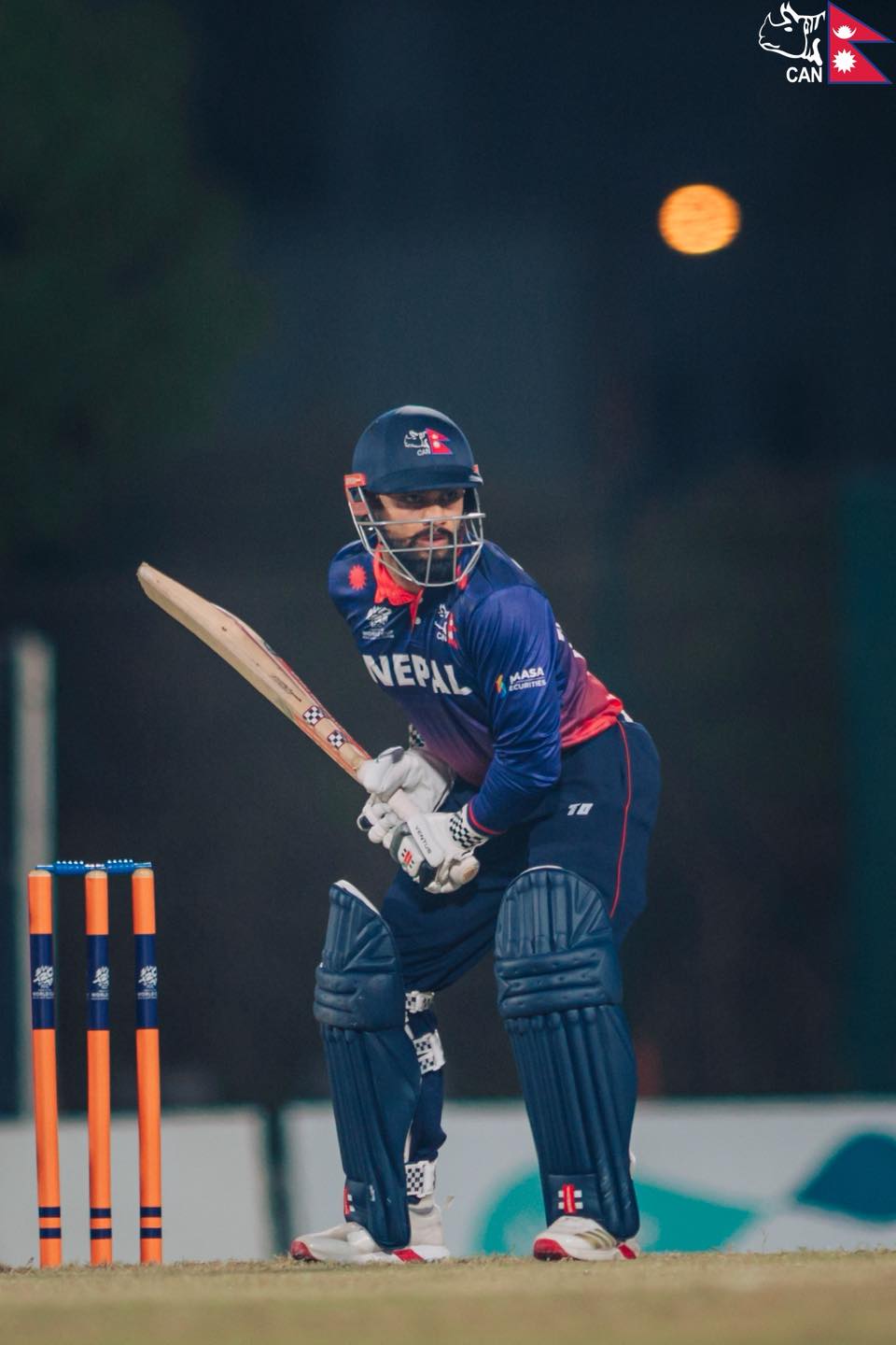 आजको खेलमा आसिफ शेख, रोहित पौडेल, दीपेन्द्रसिंह ऐरी र कुशल मल्ल सस्तैमा आउट भएका छन् । हाल भुर्तेलसँग आदिल आलम क्रिजमा रहेका छन् ।