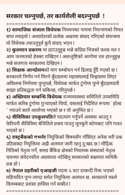 ‘नगर्नुपर्ने निर्णयमा हतारो, गर्नुपर्ने निर्णयमा बिलम्ब, सरकारको यो प्रवृत्ति समर्थन योग्य छैन । मुख्य दुई दल सम्मिलित सरकारको गति सन्तोषजनक भएन,’ शर्माले भनेका छन्, ‘कमजोरी केलाउँ, लय मिलाउँ, गति बढाउँ । सरकार अलमल बाहिर अनुभूतिमा भेटिनुपर्छ । सरकार चल्नुपर्छ, तर कार्यशैली बदल्नुपर्छ ।’