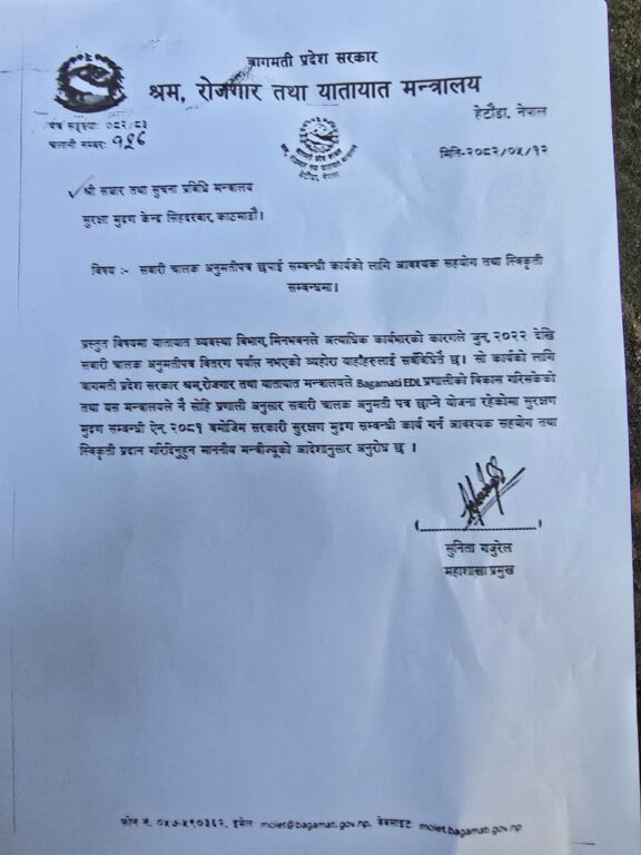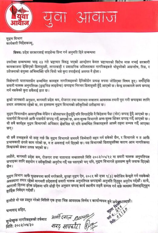 काठमाडौं– प्रदेश सरकारलाई लाइसेन्स प्रिन्ट गर्न अनुमति दिन माग गर्दै मुद्रण विभागमा पत्र बुझाइएको छ । बिहीबार युवा आवाज नामक संगठनले विभागमा पत्र बुझाएको हो ।