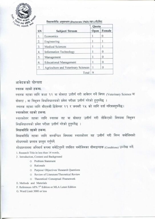 आयोगका अनुसार स्नातक तहका लागि २५ वर्ष, स्नातकोत्तर तहका लागि ३५ वर्ष र विद्यावारिधि तहका लागि ४५ वर्ष उमेर ननाघेको हुनुपर्नेछ । विद्यावारिधि तहमा अर्थशास्त्र, इन्जिनियरिङ, मेडिकल साइन्स, सूचना प्रविधि, व्यवस्थापन, शैक्षिक व्यवस्थापन तथा कृषि तथा पशु विज्ञान विषयमा कुल ९ सिट छुट्याइएको छ ।
