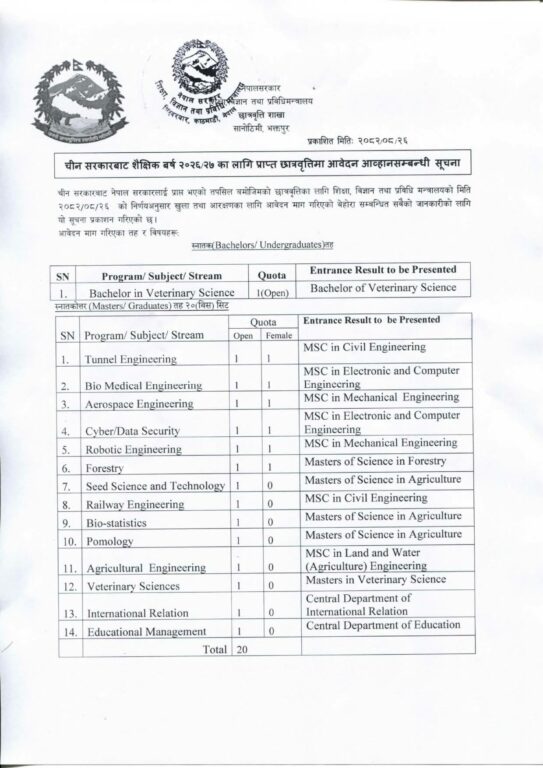चिनियाँ सरकारी छात्रवृत्ति कार्यक्रमअन्तर्गत एमबीबीएस कार्यक्रमका लागि ४ सिट छुट्याइएको छ । त्यसैगरी स्नातक, स्नातकोत्तर तथा विद्यावारिधि पिएचडी तहमा इन्जिनियरिङ, मेडिकल साइन्स, सूचना प्रविधि, अर्थशास्त्र, व्यवस्थापन, कृषि तथा पशु विज्ञान, शैक्षिक व्यवस्थापनलगायत विभिन्न विषयमा छात्रवृत्ति प्रदान गरिनेछ ।
