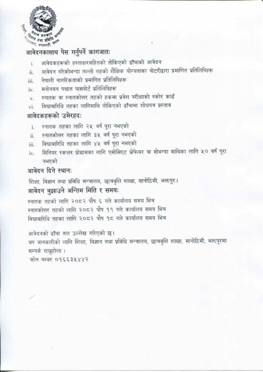 त्यस्तै, स्नातक, स्नातकोत्तर तथा विद्यावारिधि तहका लागि आवेदन दिने उम्मेदवारहरूले आवश्यक शैक्षिक प्रमाणपत्र, नेपाली नागरिकताको प्रमाणपत्र, पासपोर्टको प्रतिलिपि तथा अन्य तोकिएका कागजातसहित शिक्षा, विज्ञान तथा प्रविधि मन्त्रालयको छात्रवृत्ति शाखा, सानोठिमी, भक्तपुरमा आवेदन पेश गर्नुपर्ने जनाइएको छ ।