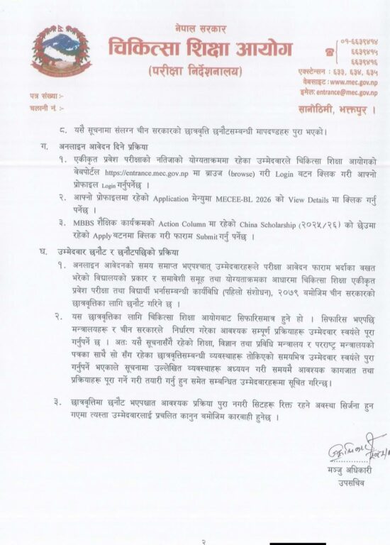 चिकित्सा शिक्षा आयोगका अनुसार एमबीबीएस तर्फ आवेदन दिन इच्छुक उम्मेदवारले लाइन आवेदन दिनुपर्नेछ। एकीकृत प्रवेश परीक्षामा उत्तीर्ण भई योग्यताक्रममा परेका उम्मेदवारहरूबाट छात्रवृत्तिका लागि छनोट गरिनेछ ।