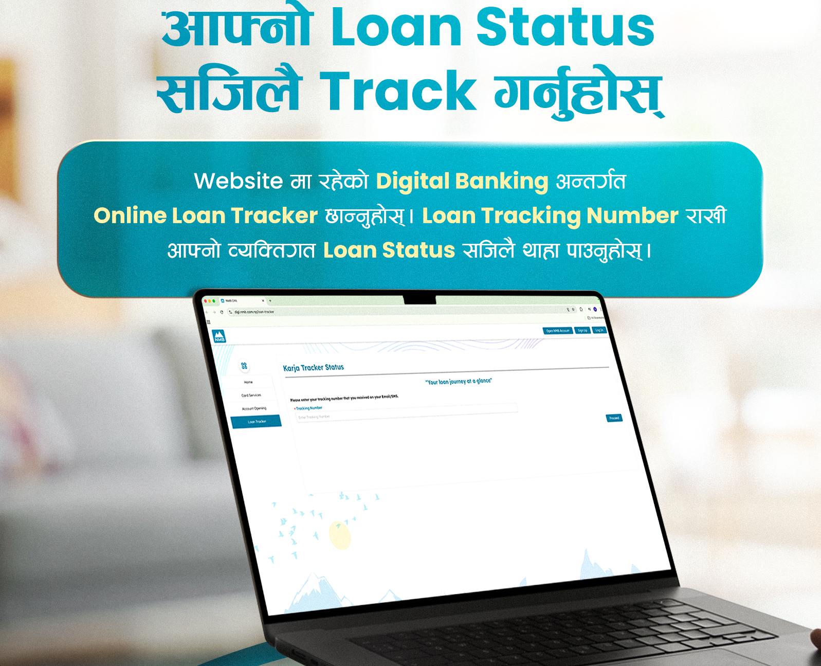 बैंकका अनुसार बैंकमा कर्जाका लागि आवश्यक कागजातहरू पेश गरेपश्चात् ग्राहकले एउटा ‘ट्र्याकिङ नम्बर’ प्राप्त गर्नेछन् । सो नम्बर प्रयोग गरी ग्राहकहरूले बैंकको वेबसाइटमा गई डिजिटल बैंकिङ खण्डमा गएर र अनलाइन कर्जा ट्र्याकिङ चयन गरी वा सिधै https://digi.nmb.com.np/loan-tracker मा गएर पनि आफ्नो कर्जा प्रक्रिया कहाँ पुग्यो भन्ने जानकारी लिन सक्नेछन् ।