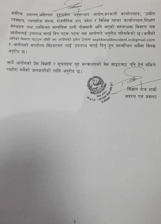आयोगले सर्वोच्च अदालत, अख्तियार दुरुपयोग अनुसन्धान आयोग, सरकारी कार्यालय, उद्योग–व्यवसाय, राजनीतिक दल, शिक्षण संस्था र निजी सम्पत्तिमा भएको क्षतिको विवरण अझै नआएको भन्दै सम्बन्धित निकायलाई विवरण पठाउन आग्रह गरेको छ।