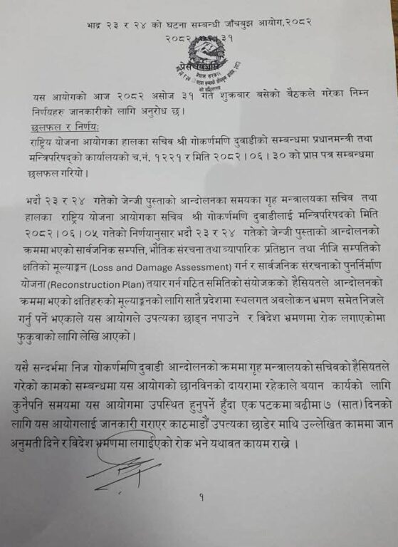 आयोगका सदस्य एवं प्रवक्ता विज्ञान राज शर्माका अनुसार दुवाडीले सातै प्रदेशमा स्थलगत भ्रमण गरी क्षतिको मूल्याङ्कन गर्नुपर्ने भएकाले उपत्यका छाड्न रोक लगाइएको निर्णयमा आंशिक फुकुवा गरिएको हो। अनौठो के छ भने जेन-जी आन्दोलन दबाउन भूमिका खेलेको आरोप लागेका उनै सचिव दुवाडीलाई क्षतिको विवरण संकलन गर्न आयोगले काठमाडौंबाहिर पठाउन लागेको हो ।