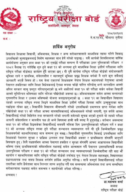 बोर्डले आफ्नो पेसागत हकहित र सुरक्षासँगै आफ्ना विद्यार्थीको भविष्यको लागि उत्तरपुस्तिका परीक्षण र कक्षा १२ को परीक्षा सञ्चालन तथा व्यवस्थापनको लागि शिक्षक महासंघ र शिक्षकहरूमा आग्रह गरेको छ ।