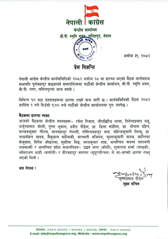 बैठकमा जेन–जी आन्दोलनपछिको परिस्थिति, संसद् विघटन, प्रतिनिधिसभा निर्वाचन, पार्टीको भ्रातृ सङ्गठन, पार्टीको महाधिवेशन लगायतका विषयमा केन्द्रीय सदस्यहरूले धारणा राखेका छन् ।
