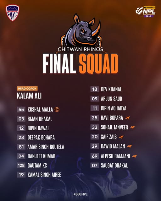 चितवन राइनोज मार्की खेलाडी कुशल मल्ल हुन् । उनले टिमको कप्तानी गर्नेछन् । टिमका प्रमुख प्रशिक्षक उमेश पटवाल हुन् । नेपाली र विदेशी खेलाडीलाई चितवनले मिलाएर लिएको देखिन्छ ।