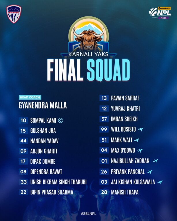 अफगानिस्तानका नाजिबउल्लाह जद्रान, नेदरल्याण्ड्सका म्याक्स ओ’डाउड र स्कटल्याण्डका मार्क वाट कर्णालीमा छन् । कर्णालीले ब्याट र बल दुवै पक्षलाई ध्यान दिएर खेलाडी छनोट गरेको छ ।