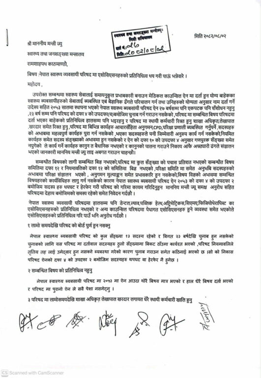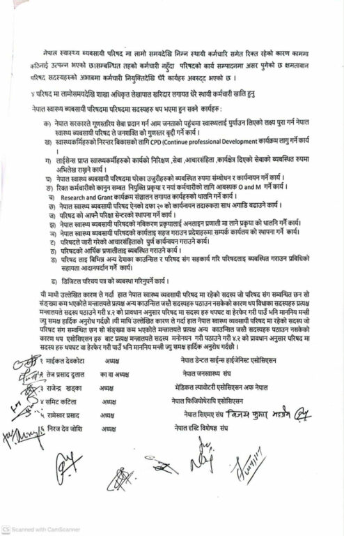 स्वास्थ्य तथा जनसंख्ष्या मन्त्री डा. सुधा शर्मालाई संयुक्त ज्ञापन पत्र बुझाउदै नेपाल डेन्टल साइन्स हाइजेनिस्ट एशोसिएसन, नेपाल जनस्वास्थ्य संघ, मेडिकल ल्याब्रेटरी एशोसिएसन अफ नेपाल, नेपाल फिजियोथेरापी एशोसिएसन, नेपाल सिएमए संघ र नेपाल दृष्टि विशेषज्ञ संघ गरी ६ वटा एशोसिएसनहरुले परिषदको काम कारबाहीलाई थप व्यवस्थित बनाउन सदस्यका रुपमा आफ्नो पनि प्रतिनिधित्व गराउन माग गरेका हुन् ।