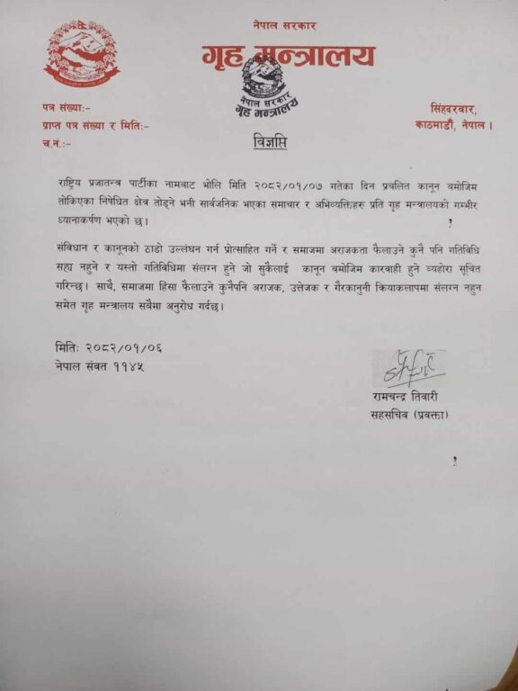 मन्त्रालयले आज एक विज्ञप्ति जारी गरी राष्ट्रिय प्रजातन्त्र पार्टीका नामबाट आइतबार प्रचलित कानुनबमोजिम तोकिएका निषेधित क्षेत्र तोड्ने भनी सार्वजनिक भएका समाचार र अभिव्यक्तिप्रति गम्भीर ध्यानाकर्षण भएको जनाएको छ ।
