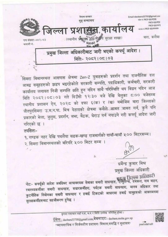 जिल्ला प्रशासन कार्यालय बाराले बुधबार दिउँसो १२:३० बजेदेखि बेलुका ८:०० बजेसम्म सिमरा क्षेत्रमा कर्फ्यू आदेश जारी गरेको छ।