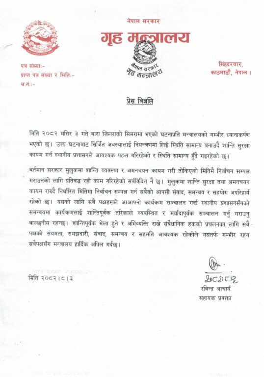 मन्त्रालयद्वारा जारी विज्ञप्तिमा मुलुकमा शान्ति–सुरक्षा कायम गर्दै तोकिएको मितिमै निर्वाचन सम्पन्न गराउन सरकार पूर्ण रूपमा प्रतिबद्ध रहेको उल्लेख छ। निर्वाचनको तयारीलाई सहज र सुरक्षित बनाउने प्रक्रियामा सबै पक्षको संयमता, समझदारी, संवाद र समन्वय आवश्यक रहेको मन्त्रालयले भनेको छ।